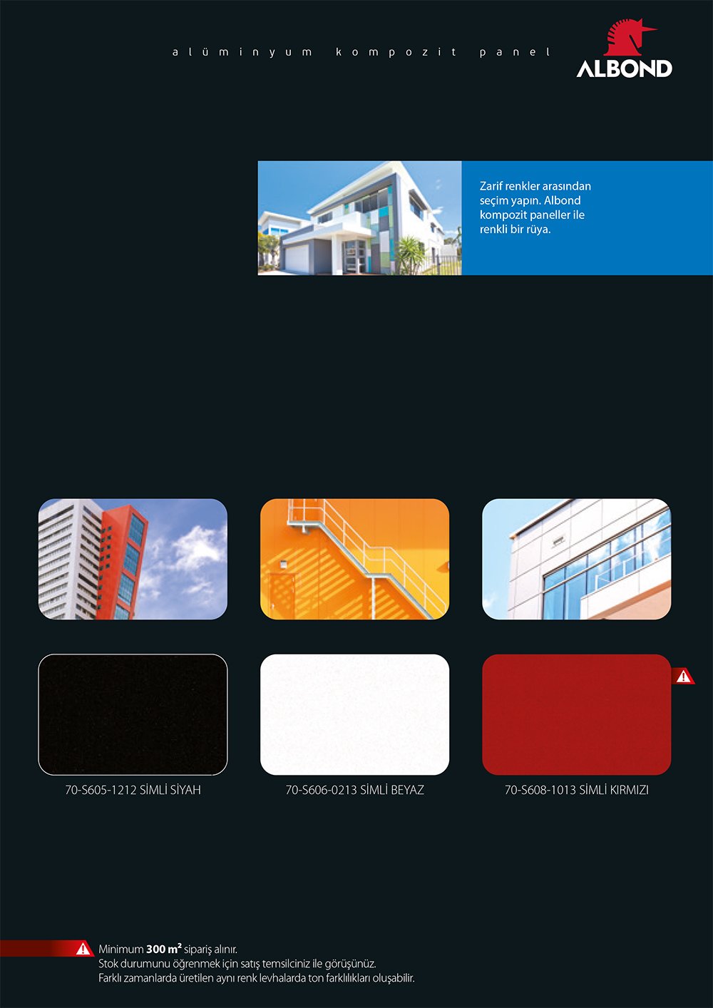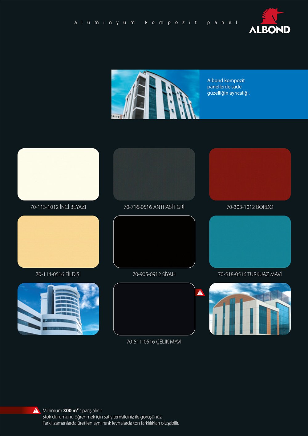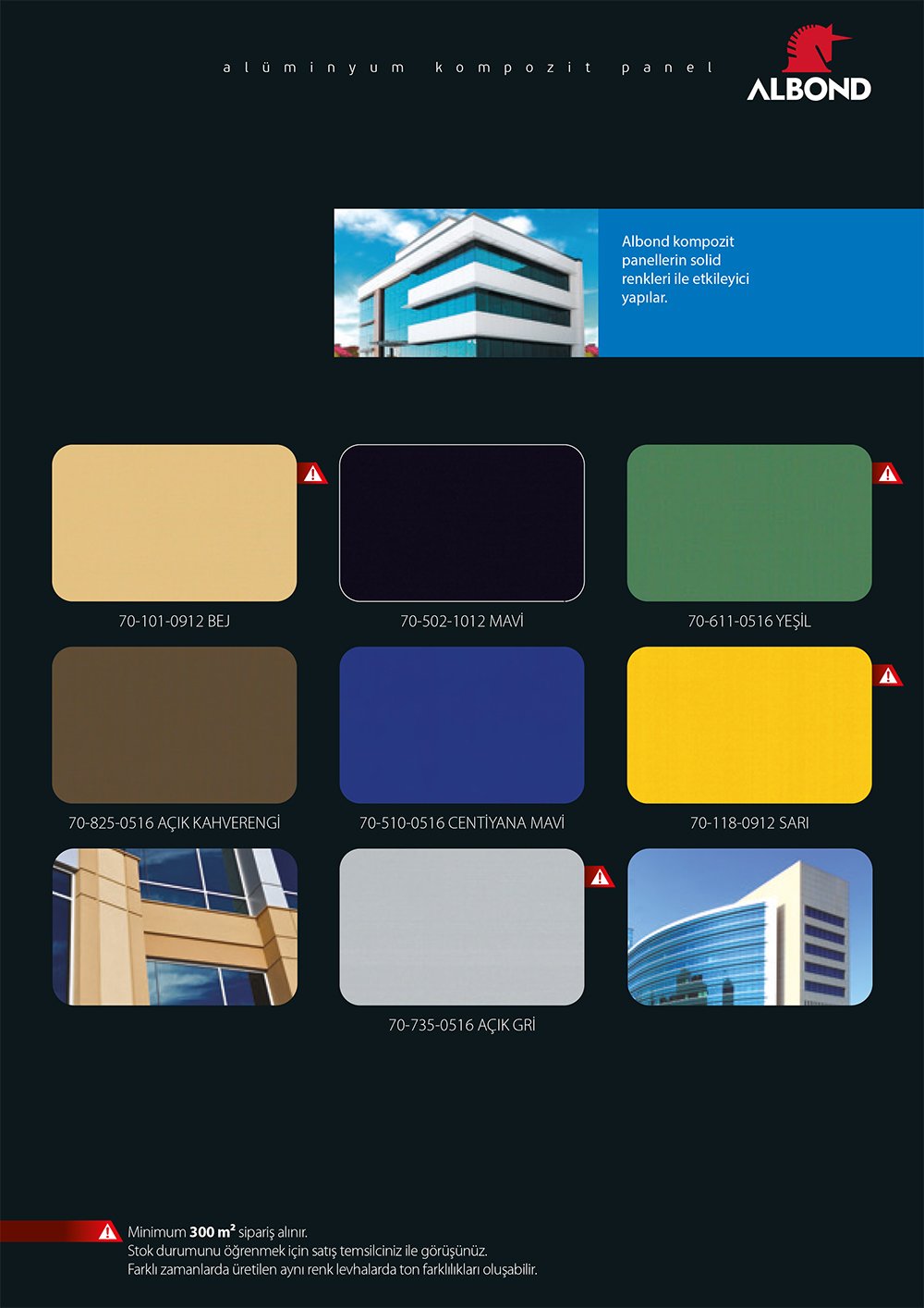 Fabrikaların renk kartelasında genellikle ana renkler bulunduğundan,  özel renk ihtiyacı olan projelerinizde “Albond 7000 Özel Renk Alüminyum Kompozit Panel Üretimi” hizmetimiz ile siz değerli müşterilerimize özel çözümler sunmaktayız.