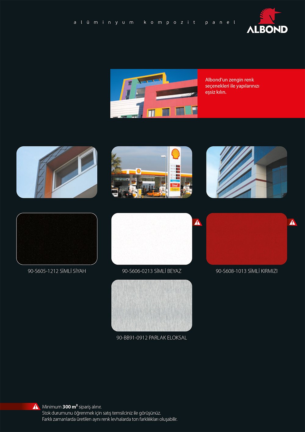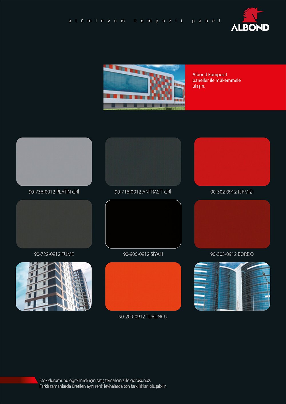 Fabrikaların renk kartelasında genellikle ana renkler bulunduğundan, özel renk ihtiyacı olan projelerinizde “Albond 9000 Özel Renk Alüminyum Kompozit Panel Üretimi” hizmetimiz ile siz değerli müşterilerimize özel çözümler sunmaktayız.