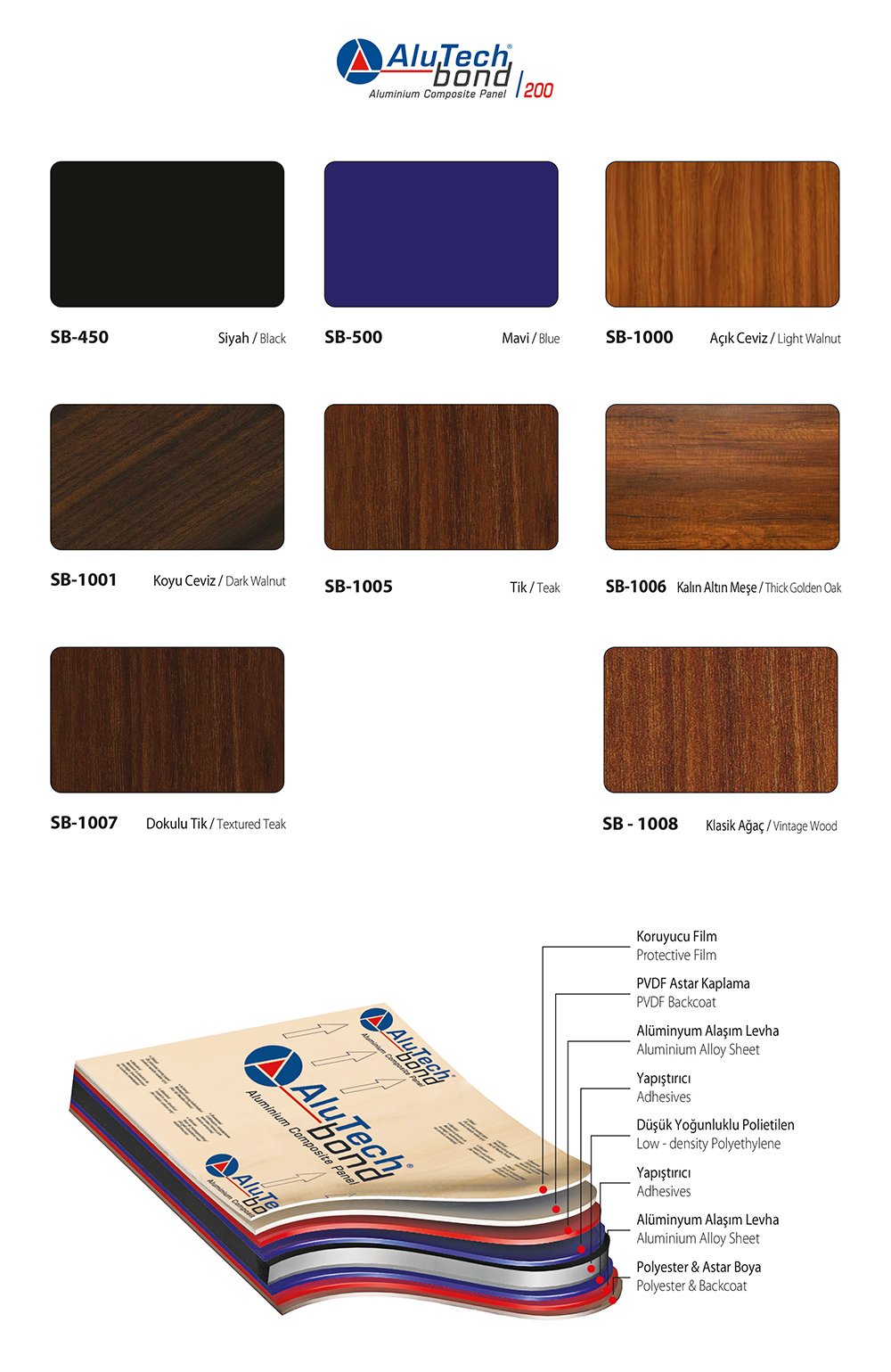 Polietilen maddenin iki yüzeyinin alüminyum levha ile kaplanmasıyla meydana gelen yapı malzeme Alutechbond 200 Alüminyum Kompozit Panel olarak tanımlanır. Film veya yapıştırıcı granül ile polietilenin alüminyum levhaya yapışması sağlanır. Üst alüminyum levha boyalıdır. Bu nedenle yüksek yüzey dayanımı söz konusudur.